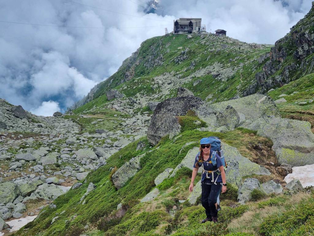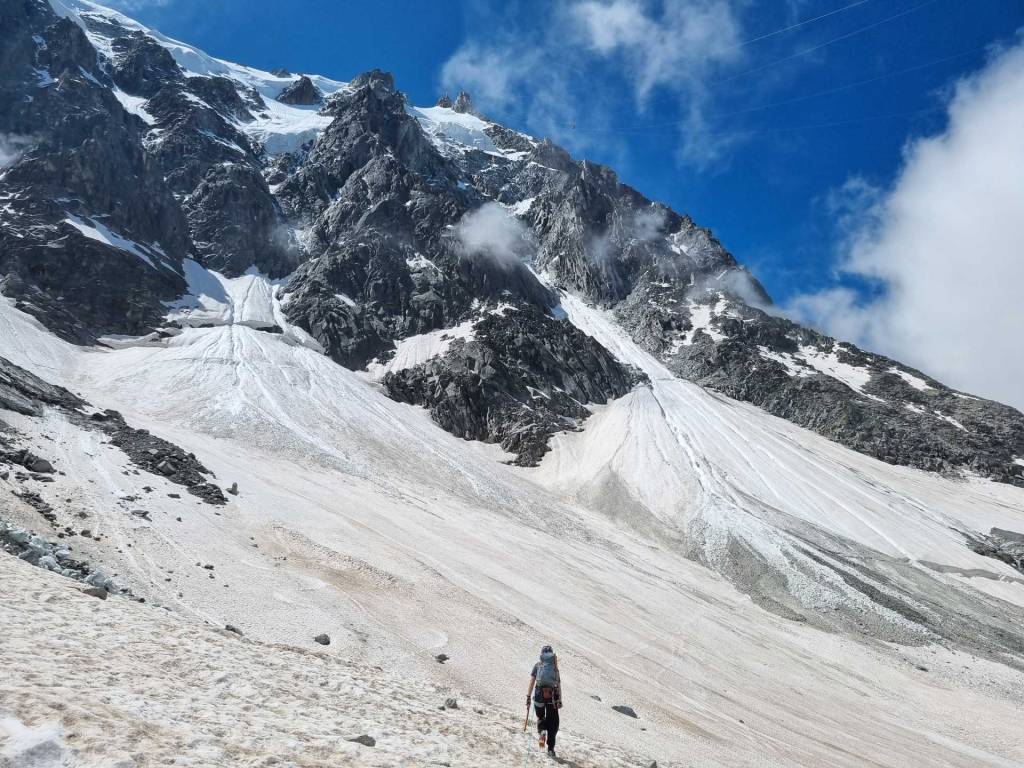 Having decided on spending two days on the wall, we opted for a late start on the first day to get some extra sleep and start the climb well rested. Happily unaware that this leisurely start would prove less than ideal, we headed to the Aiguille du Midi telepherique to catch a cabin at around 10:30am. We got off at the midway station at the Plan de l’Aiguille and from there we followed paths leading up and north toward the lateral moraine flanking the Pélerins glacier. Clouds clung to the rocky slopes and summits around us, hiding all but the lower rock sections from our view as we walked across the green hills. After about an hour we reached the glacier, at which point we put on crampons, roped up, and set our sights on a right leaning snow field at the far side of the glacier, which would take us onto the Frendo Spur.