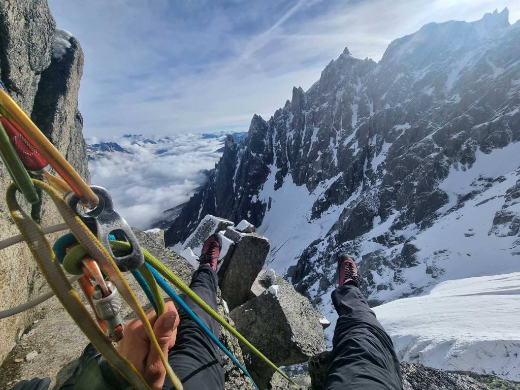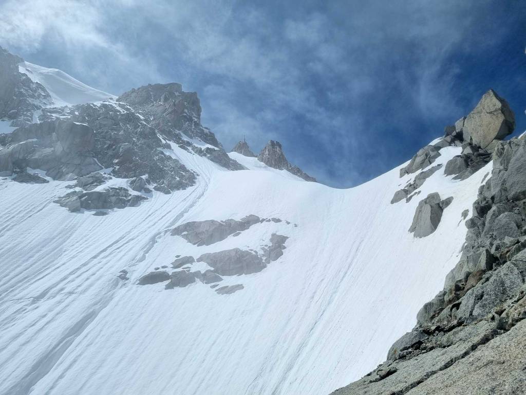 A few easy, traversing pitches in a stunning position marked the end of the rock section. Below us clouds covered the valley floor and contributed to an otherworldly atmosphere. We took a short break on a large ledge with a view toward the Aiguille du Midi and watched the telepherique cabins go up and down as we soaked in the sun and prepared for the snow and ice climb ahead of us. Crampons and ice tools were extracted from backpacks and racks were adjusted to account for the change of terrain. Above us we could see the contour of the famous snow ridge snaking its way up the slope toward the huge rognon that guards the top of the route. Soon we would make our way up it. The wind was picking up and clouds were beginning to gather and rise from the valley, so we decided to push on and try to make it to the top before the conditions got much worse.