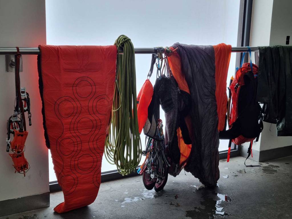 May had seen lots of snow at altitude and the unstable weather continued throughout June and into July, but the forecast for July 2-3 looked at least mildly promising and so we decided on those dates for the climb and promptly began preparing. We decided on a single rack of cams with a couple of the mid-sizes doubled up, a few nuts, two ice screws each and 2×60 meter half ropes. We both brought rock shoes. After some back-and-forth discussion we decided to keep things simple by leaving the stove at home and bringing some additional water instead. For food I brought a bunch of energy bars and for the bivy I a lightweight bivy sack, a sleeping bag and a small pad.