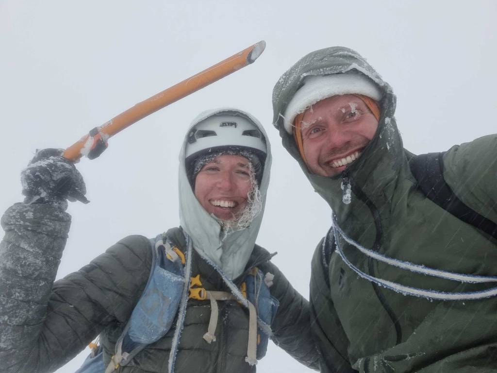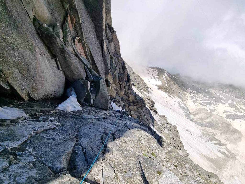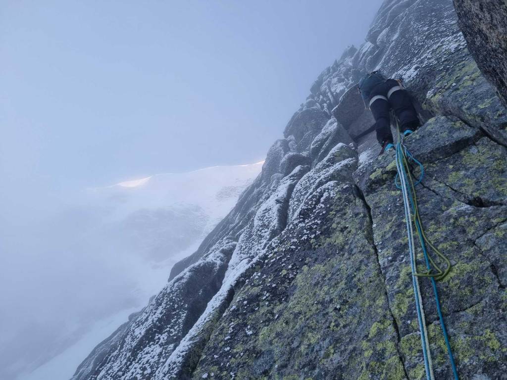 By this time the weather had taken a turn for the worse. Visibility was down to a few tens of meters and the warm rays of the sun suddenly felt very far away. The gully went on for a few pitches and offered soft, mushy snow and occasional ice interspersed with loose rock that required a bit of care to navigate safely, but other than that presented no real difficulty. Near its end we found a snowy, exposed notch, and on the other side of the notch a steep rock section disappeared into the dim fog above. A soaking wet corner crack indicated the obvious way forward: the crux pitch of the route, graded at 5c. We decided that I should lead it.