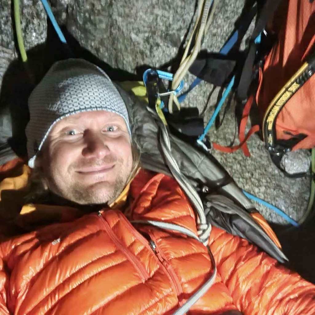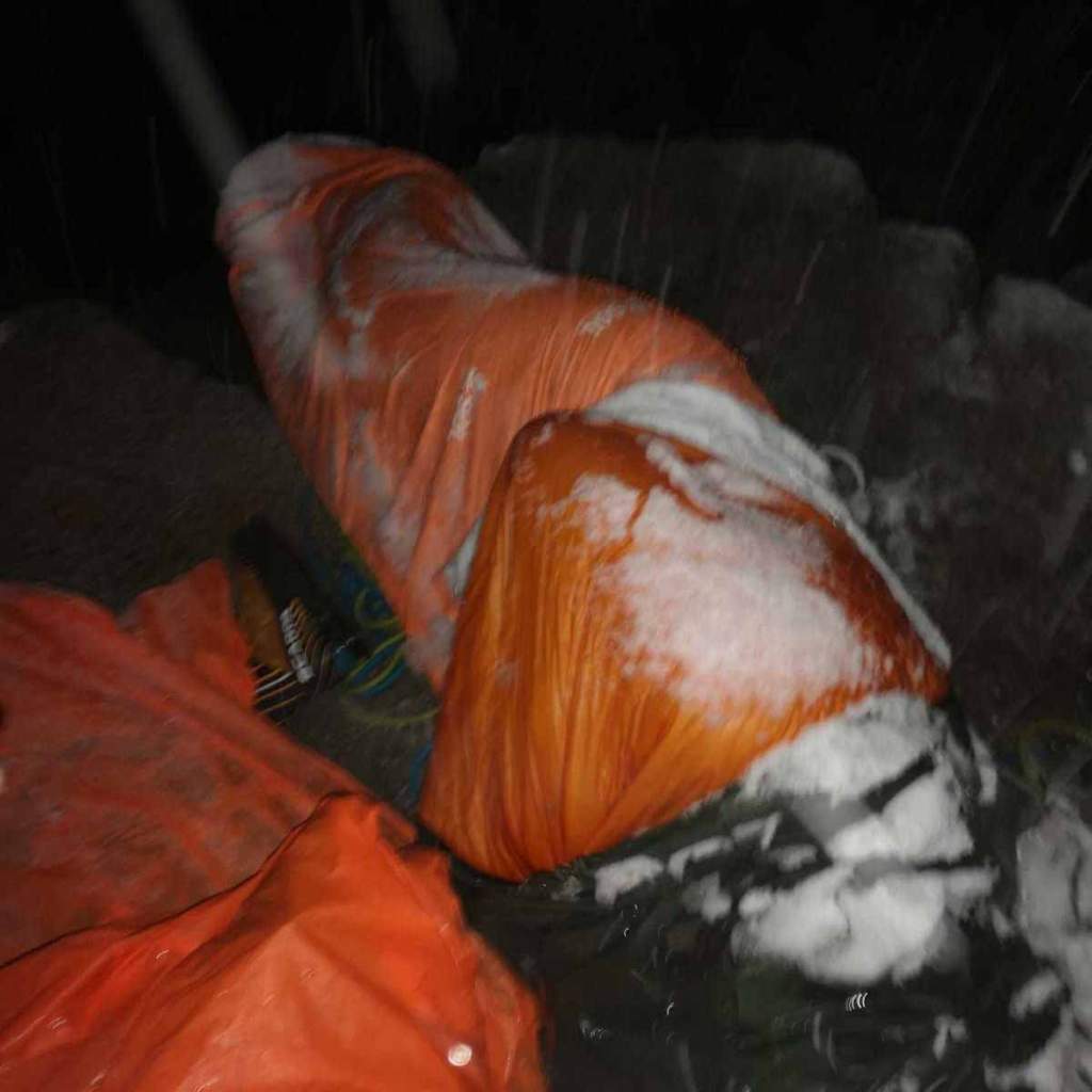 I ate a couple of energy bars and tried to arrange my bivy in the most comfortable position possible, using one of the ropes to create a horizontal platform where the ledge began to slant off. My bivy sack is a on the small side, so I put my rain shell over my head and my shoulders to avoid getting wet in case of more precipitation. The snowing almost stopped. I fell asleep.