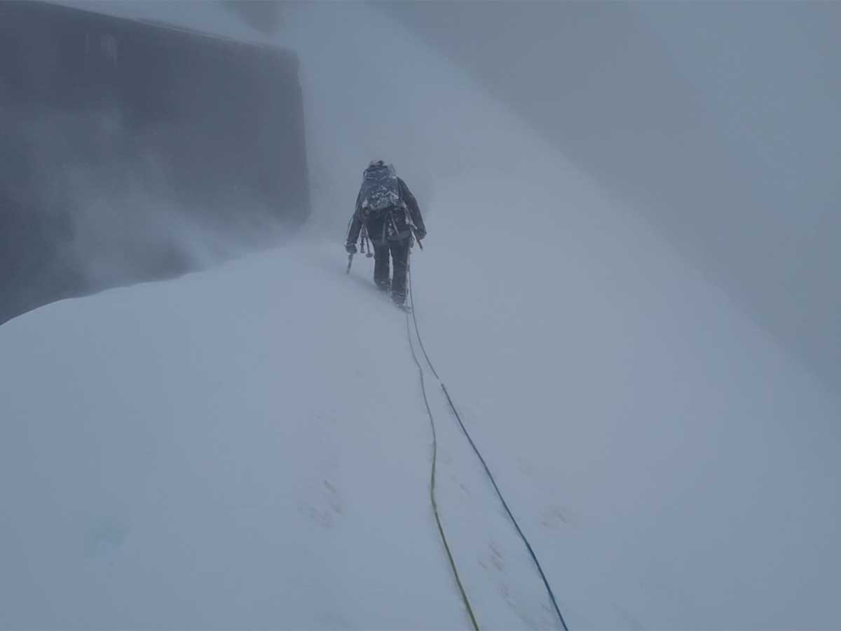 We simul-climbed the face up to the snow ridge and then continued along it heading straight for the rognon. The visibility was becoming worse by the minute — soon we couldn’t see the rognon at all — and while at first we had been able to follow faint footsteps along the ridge, they quickly disappeared as we climbed higher. After the ridge had petered out we found ourselves in an area of snow and scattered rocks without any clearly distinguishable features. A bit unsure of where to go, we decided to set up a belay and pitch out the rest of the route. The climbing was not difficult, but the snow was soft and variable and decent protection was hard to find and far between. By this time my gloves were frozen stiff, making rope handling a little difficult, but apart from that the climbing went without much difficulty. We kept moving up and left, trying to keep the pace up to keep warm and hoping that we were heading in the right direction. My fear was that we’d stray from the route and end up in a dead end in a gully somewhere — resulting in having to downclimb and losing precious time and energy — but after a few pitches I was able to spot a bolted belay station on a rock face to my right. Before long the face steepened and the soft snow became harder until it eventually became ice (a welcome change) and soon after we finally stood on the crest above the rognon, with only the final snow ridge to the Aiguille du Midi station left.