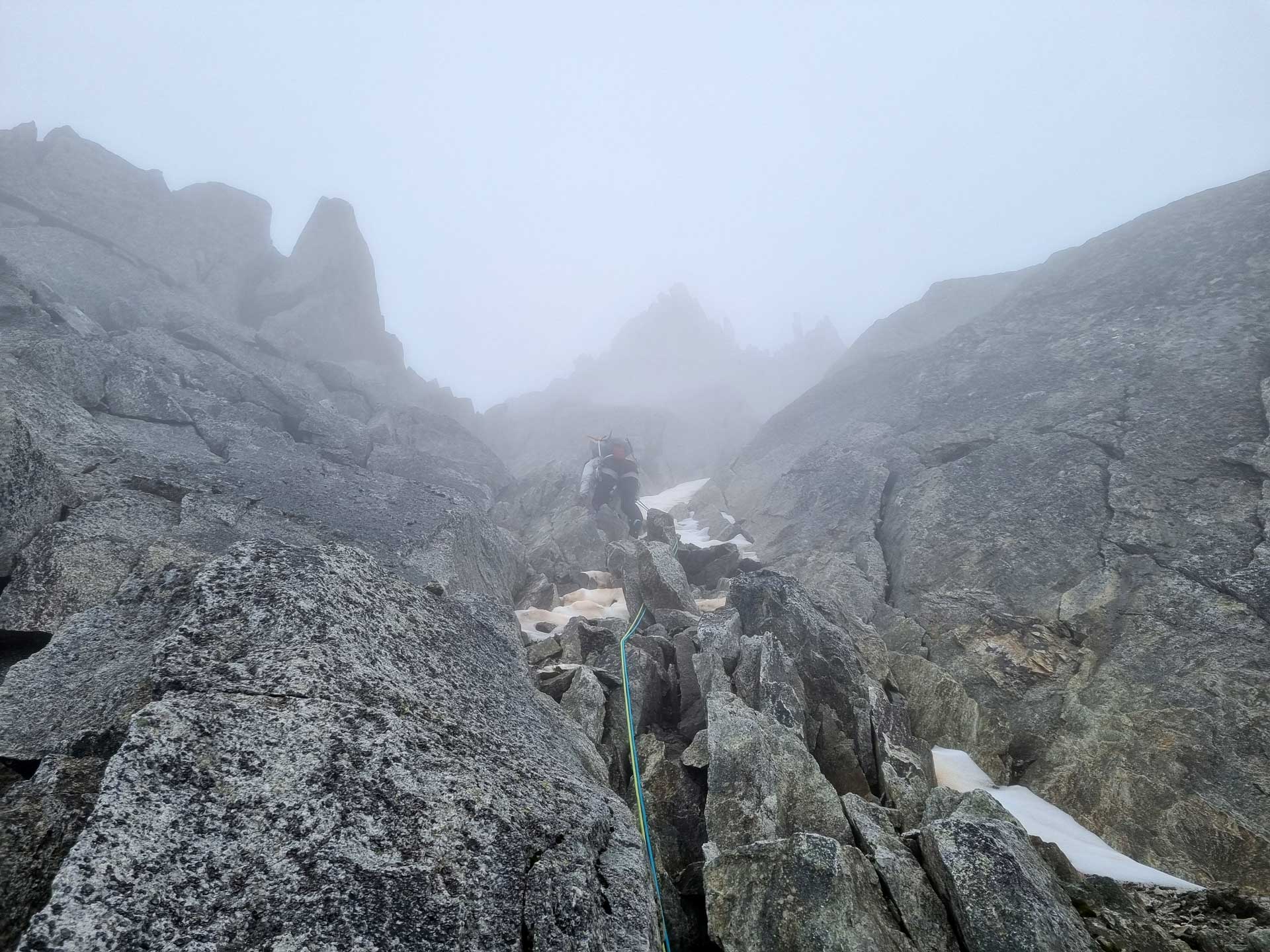 By this time the weather had taken a turn for the worse. Visibility was down to a few tens of meters and the warm rays of the sun suddenly felt very far away. The gully went on for a few pitches and offered soft, mushy snow and occasional ice interspersed with loose rock that required a bit of care to navigate safely, but other than that presented no real difficulty. Near its end we found a snowy, exposed notch, and on the other side of the notch a steep rock section disappeared into the dim fog above. A soaking wet corner crack indicated the obvious way forward: the crux pitch of the route, graded at 5c. We decided that I should lead it.