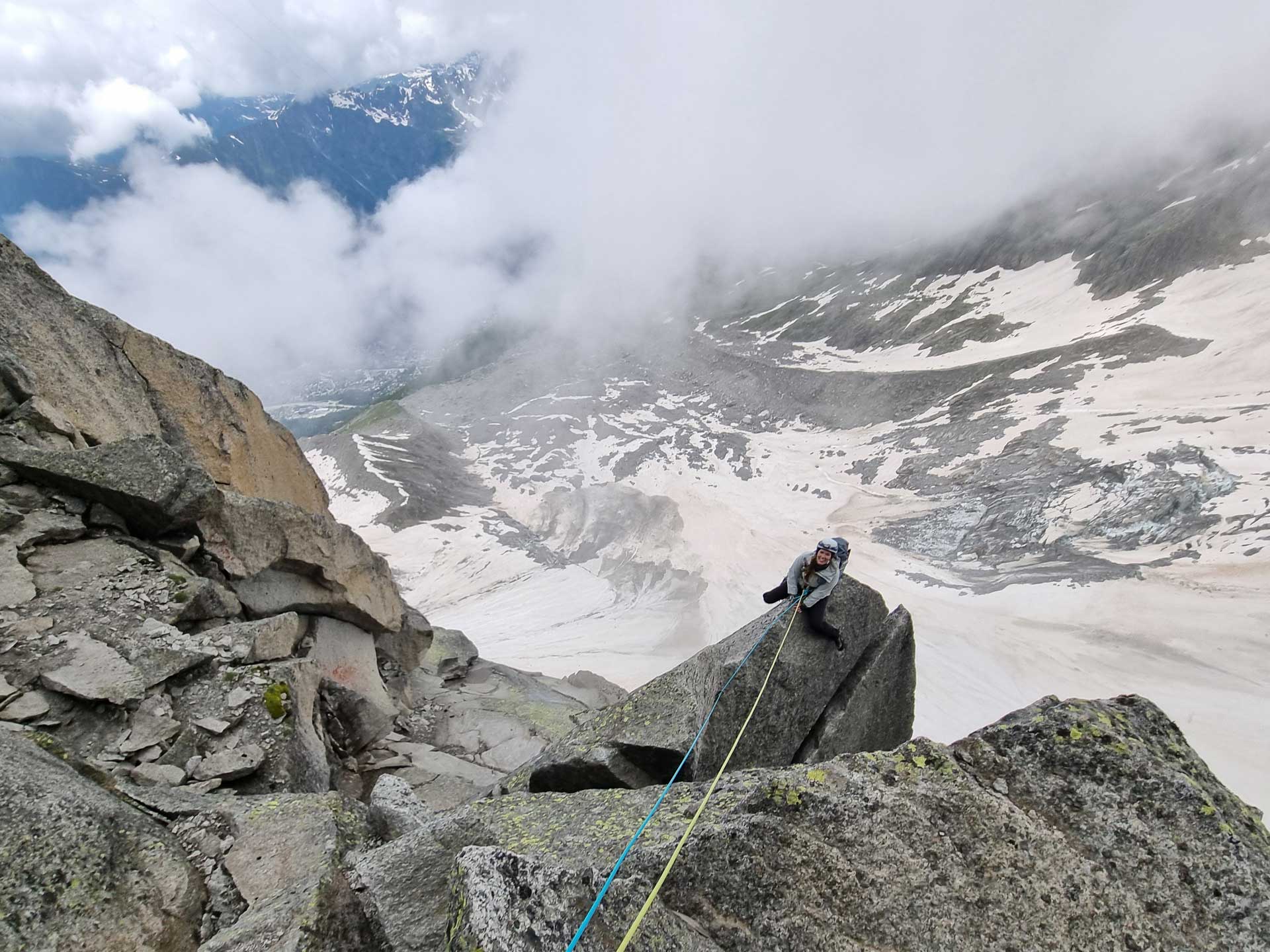 After three or four pitches the clouds scattered and we could see the sun light up the snow crest high above us. A little later we were climbing on the left-hand (east facing) side of the spur when all of a sudden we were bathed in warm rays as the sun finally rose above the Aiguille du Plan. Once this happened it didn’t take long for the rock to dry, and although snow and ice lingered wherever there was shade, scaling the remainder of the rock section in the sun became a rather enjoyable enterprise.